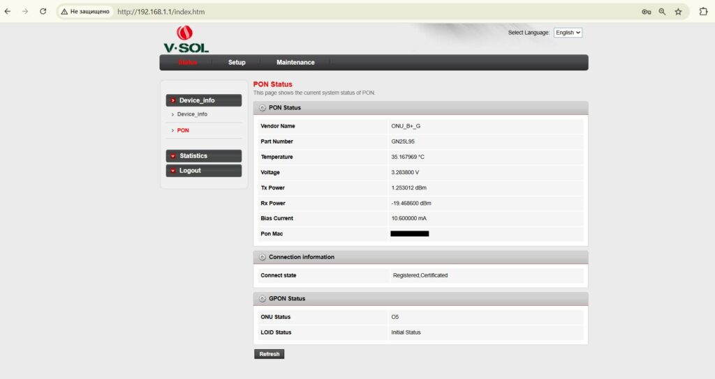 show ont optical-info 4 1 Просмотр сигнала на ону